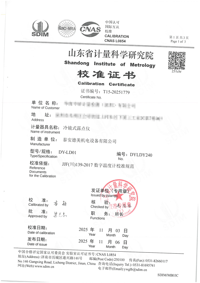 冷鏡式露點儀校準證書 2025-11-7 本文被閱讀 1590 次