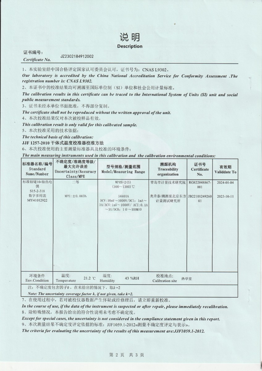 上一條:甘肅東興嘉宇新材料有限公司 干體溫度校驗爐 校準證書(1)下一條:水三相點瓶凍制與保存裝置校準證書