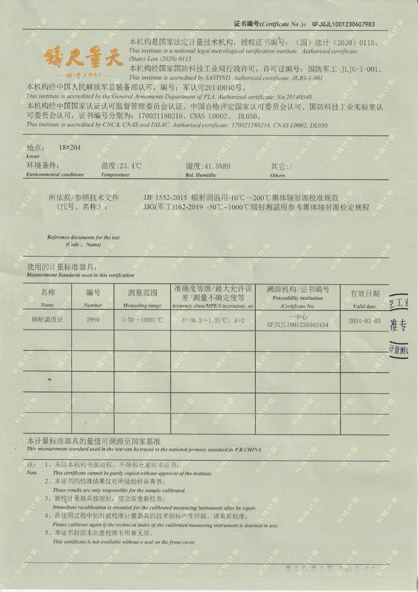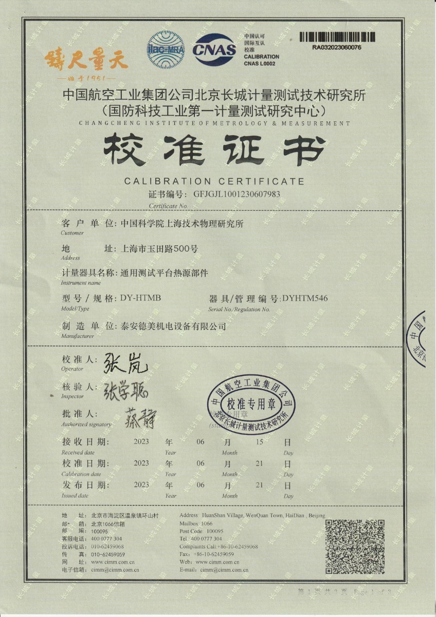 | 上一條:中國科學(xué)院上海技術(shù)物理研究所-通用測試平臺(tái)熱源部件(DYHTM545) | 下一條:水三相點(diǎn)瓶凍制與保存裝置校準(zhǔn)證書 |