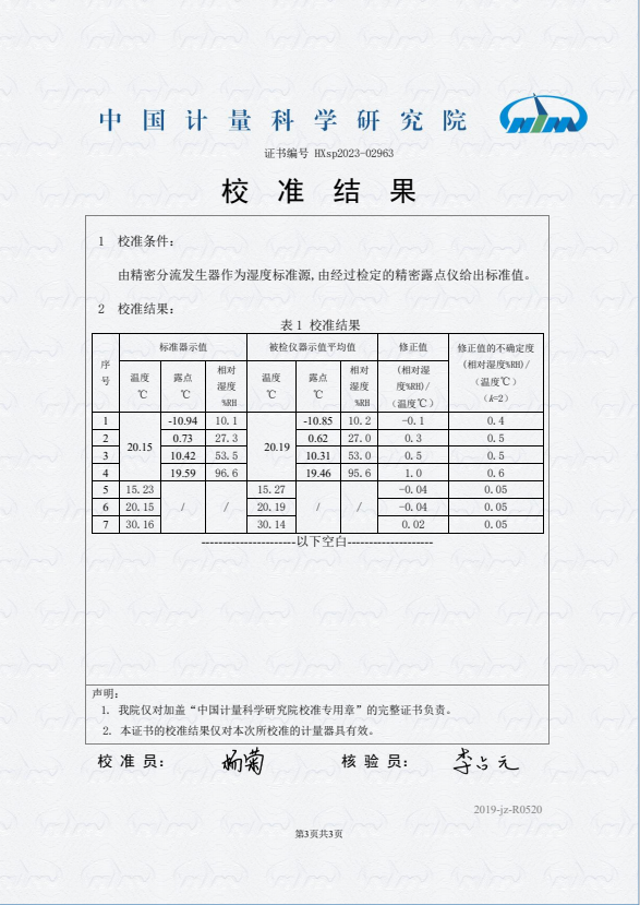 露點(diǎn)儀校準(zhǔn)證書