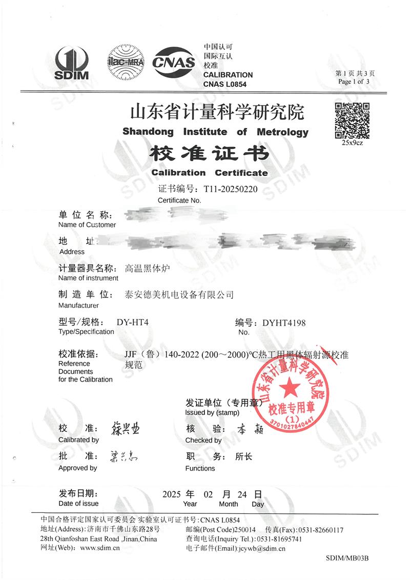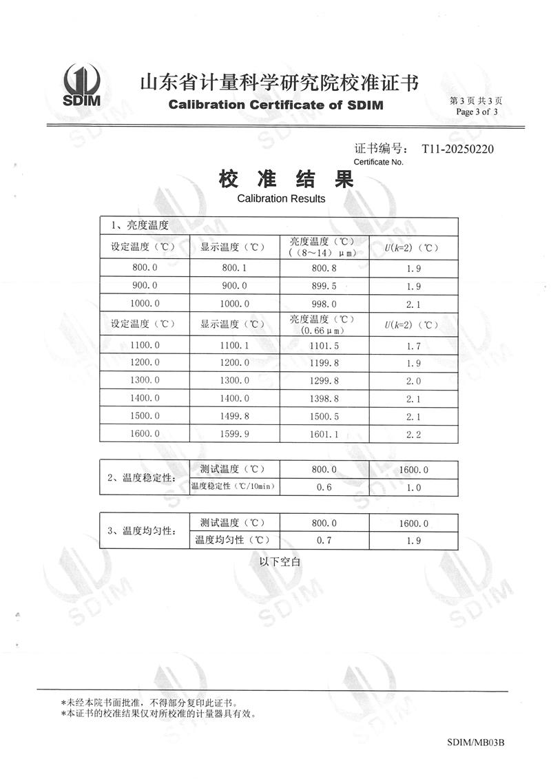 高溫黑體爐(800~1600℃)校準證書 2025-2-26 本文被閱讀 5649 次