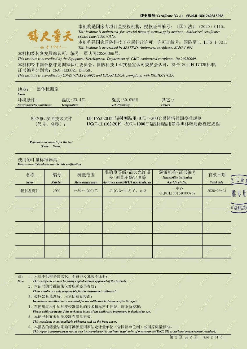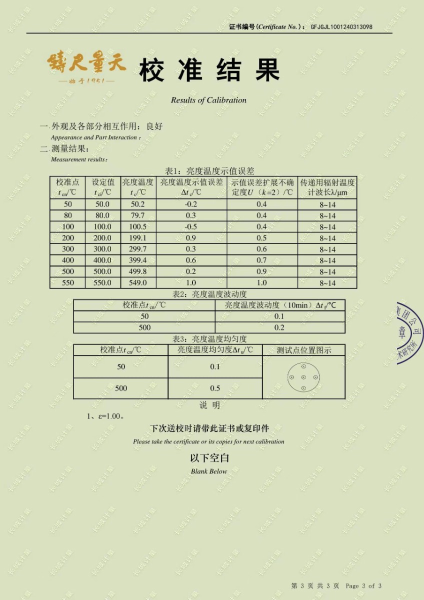 黑體輻射源校準(zhǔn)證書 2024-4-11 本文被閱讀 6700 次