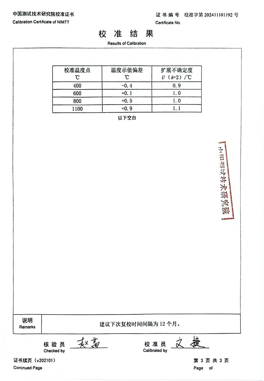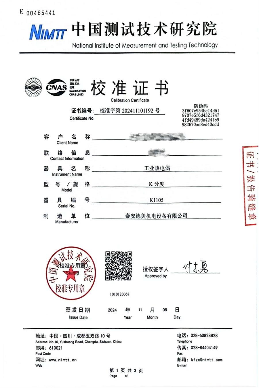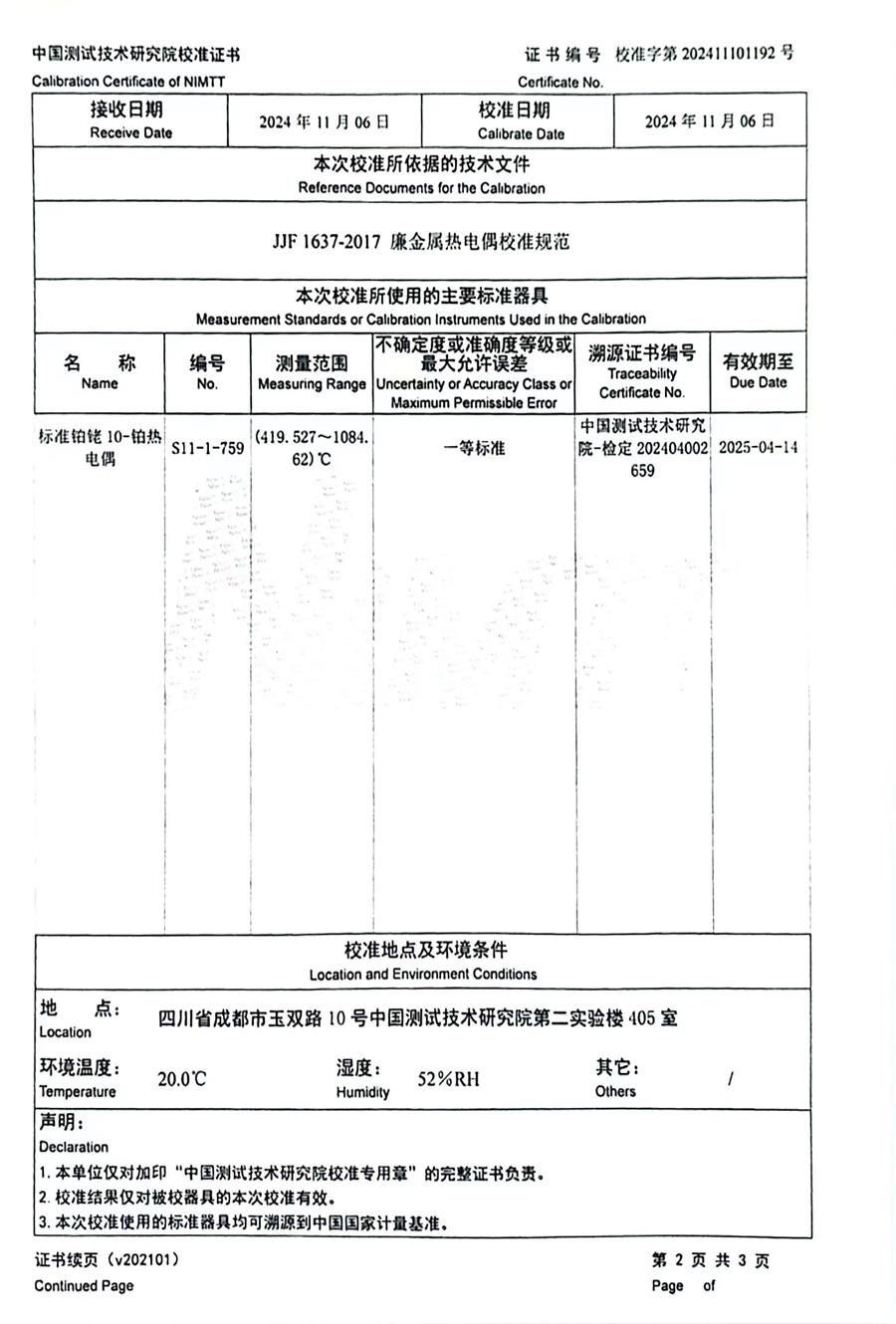 K分度熱電偶校準證書 2024-11-9 本文被閱讀 7633 次