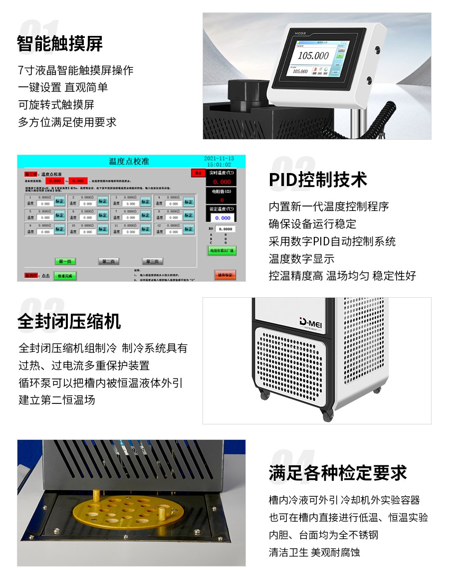 DY-RTS60制冷恒溫槽(-60℃-105℃)是高精度自控式溫度檢定設(shè)備,控溫精度高,溫場(chǎng)均勻,穩(wěn)定性好,操作方便,采用全封閉壓縮機(jī)制冷系統(tǒng),外殼和內(nèi)膽都采用全不銹鋼材料制造,產(chǎn)品供計(jì)量部門(mén)作一、二等標(biāo)準(zhǔn)水銀溫度計(jì),貝克曼溫度計(jì)。工業(yè)鉑熱電阻,標(biāo)準(zhǔn)銅-康銅熱電偶檢定之用,也可作高精度熱、冷源供生產(chǎn)、科研使用。制冷恒溫槽是一種高精度自控式數(shù)顯溫度檢定裝置,它具有溫度穩(wěn)定性好,溫場(chǎng)均勻,控溫精度高等特點(diǎn)。制冷系統(tǒng)采用全封閉制冷機(jī),具有噪音低、可靠性好、壽命長(zhǎng)。數(shù)顯溫控儀按PID調(diào)節(jié)規(guī)律實(shí)現(xiàn)溫度自動(dòng)控制,結(jié)構(gòu)緊湊、操作方便、槽溫讀數(shù)直觀。適用于各計(jì)量、生化、石油、氣象、能源、環(huán)保、醫(yī)藥等部門(mén)及生產(chǎn)溫度計(jì)、控溫器等廠家進(jìn)行物理參數(shù)的檢測(cè),并可為其他實(shí)驗(yàn)研究工作提供恒溫源。