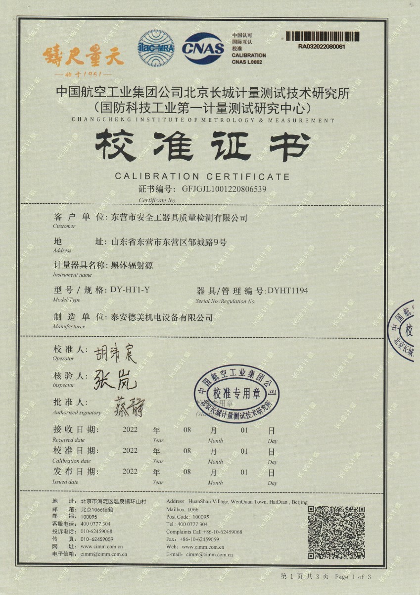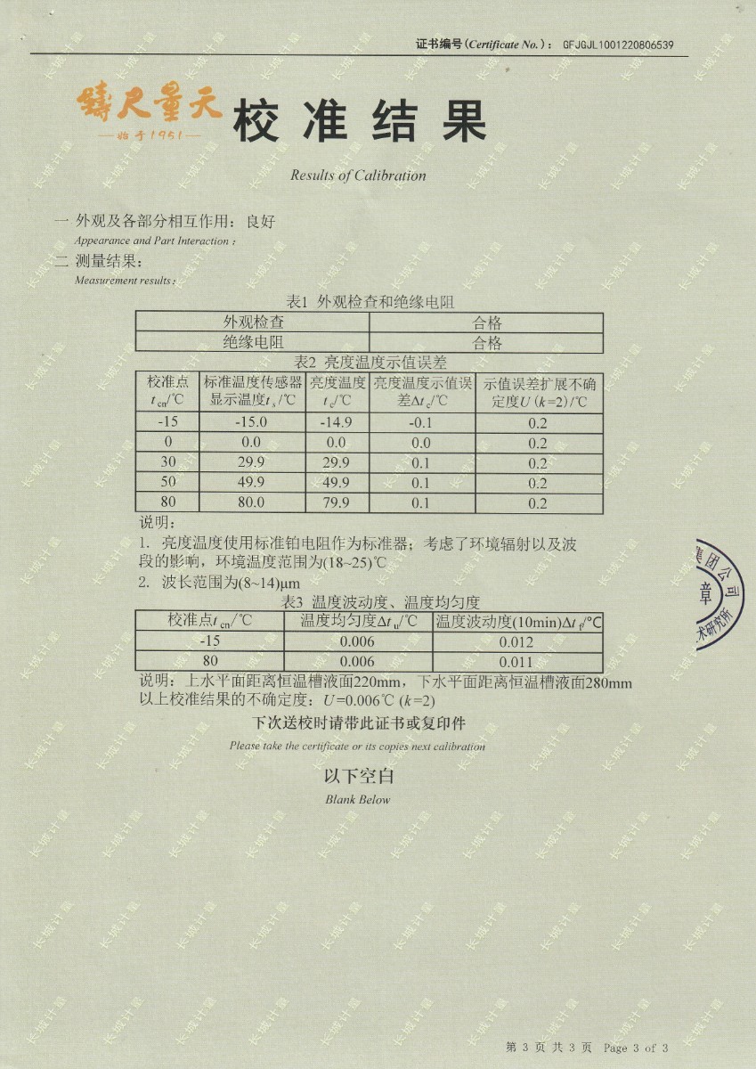 | 上一條:東營市安全工器具質(zhì)量檢測有限公司-黑體輻射源DY-HT2 | 下一條:水三相點瓶凍制與保存裝置校準證書 |