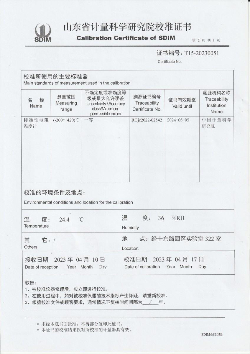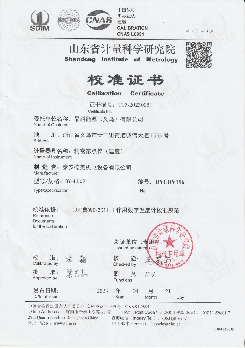 晶科能源(義烏)有限公司 精密露點儀(溫度)校準證書 2023-5-4 本文被閱讀 12918 次