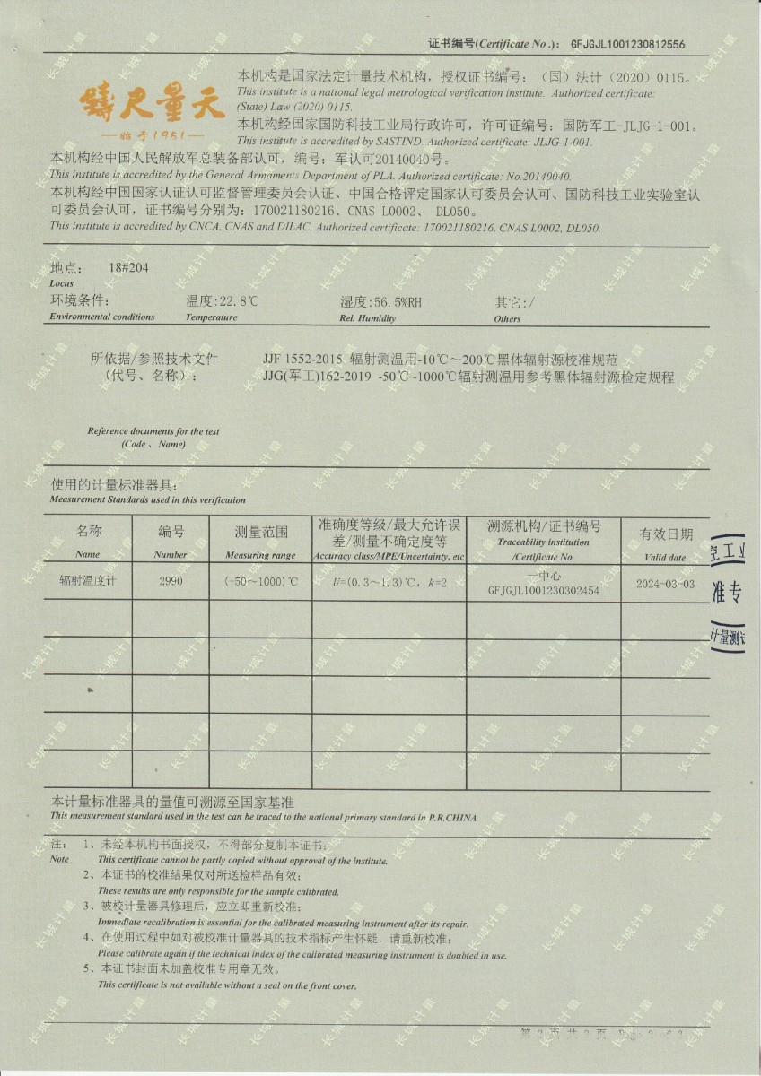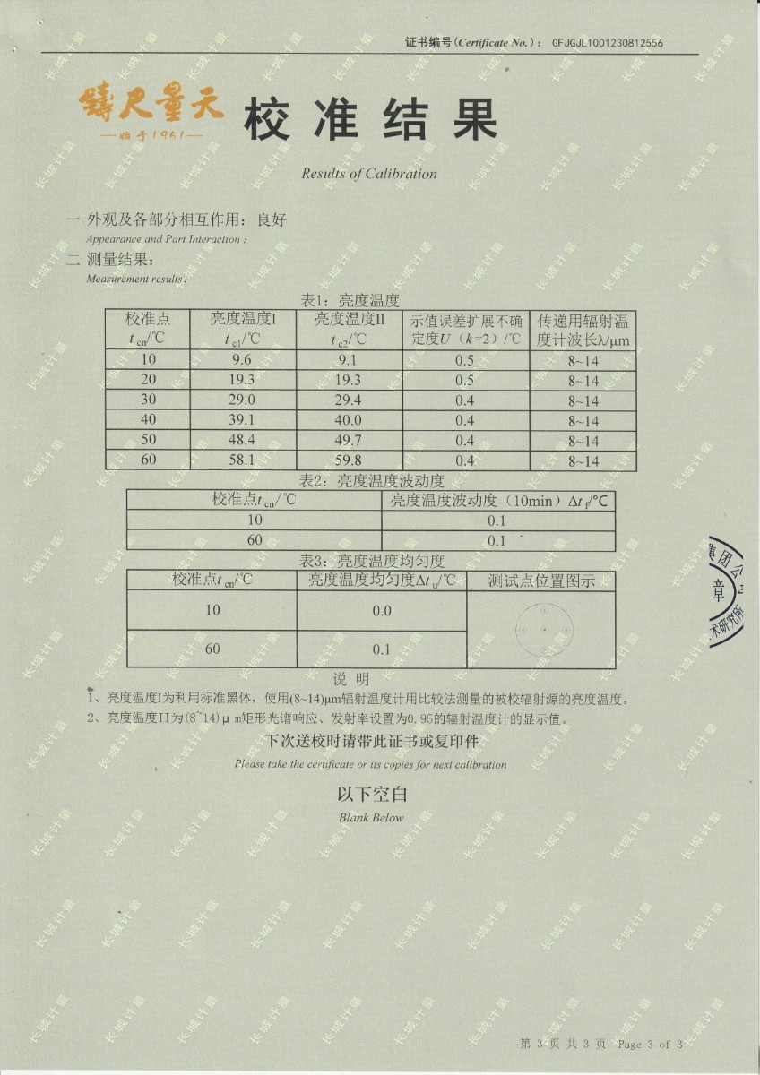 | 上一條:面源黑體爐DYHT1M141校準(zhǔn)證書 | 下一條:水三相點瓶凍制與保存裝置校準(zhǔn)證書 |