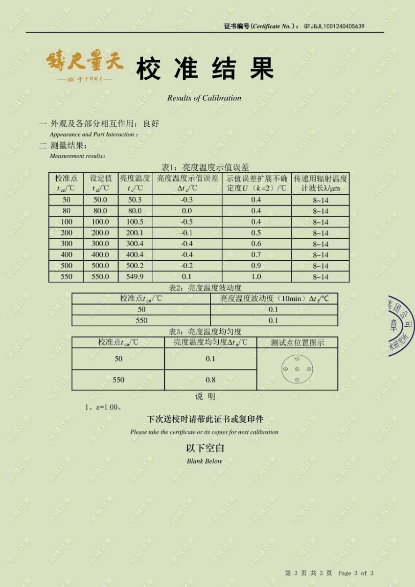 黑體爐校準(zhǔn)證書 2024-4-24 本文被閱讀 9552 次