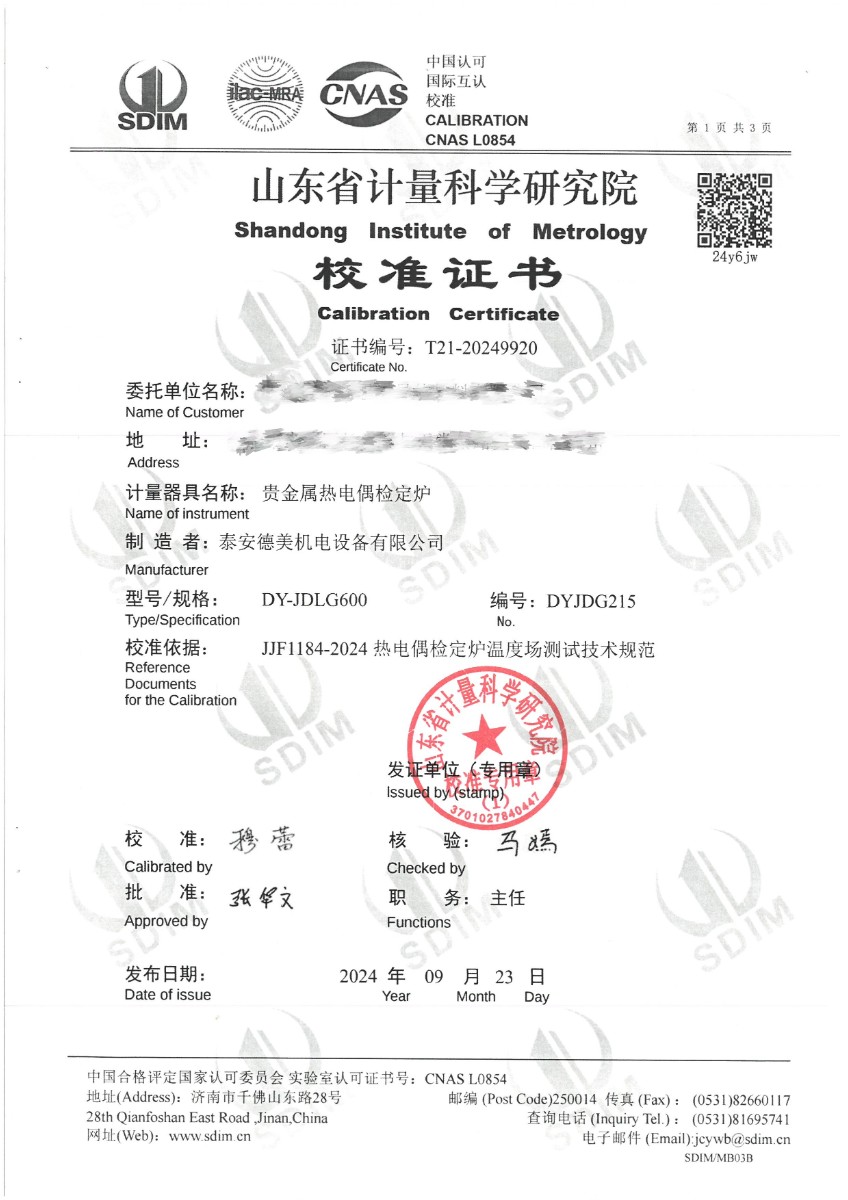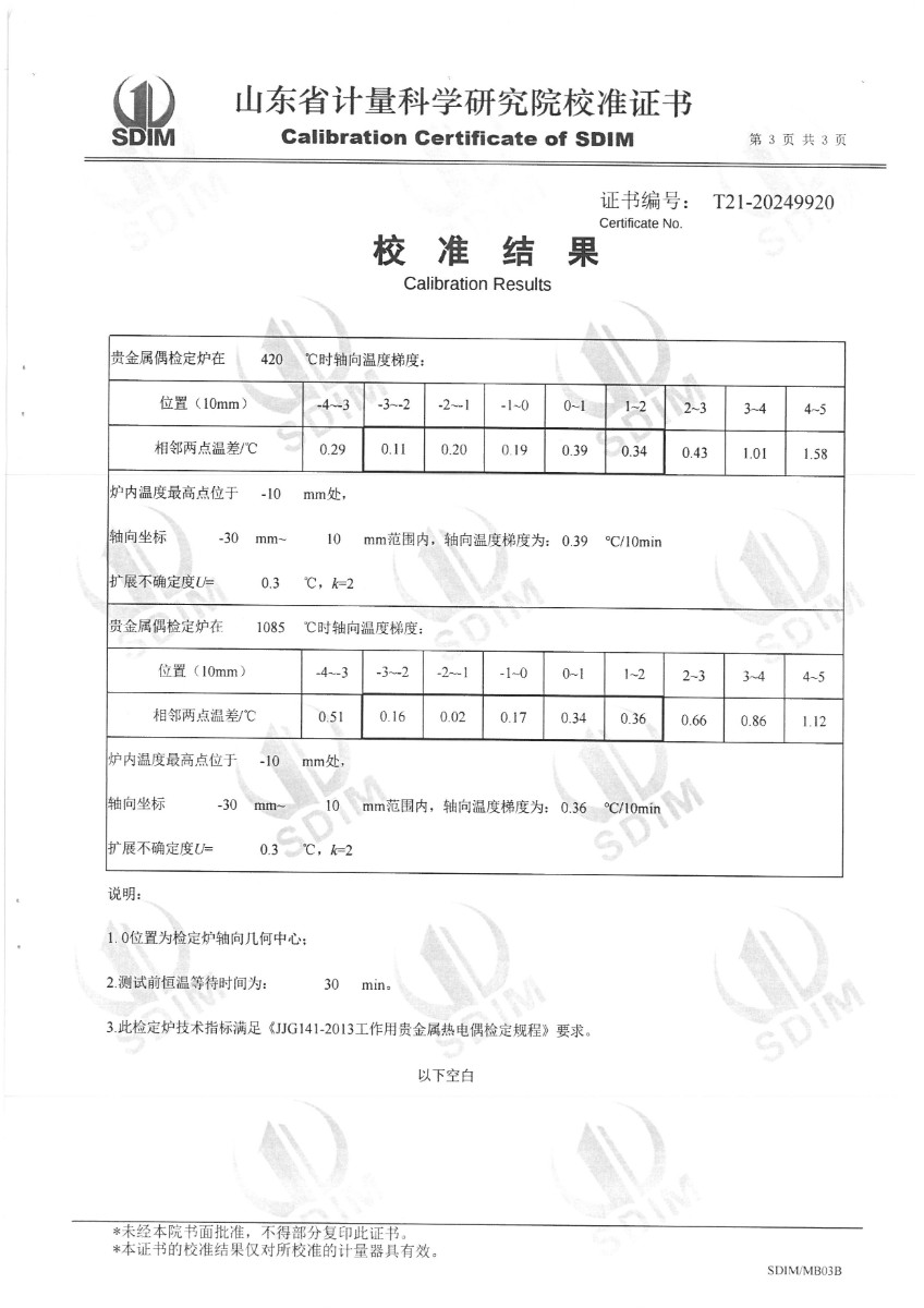 貴金屬熱電偶檢定爐(300~1000℃)校準證書 2024-9-24 本文被閱讀 7052 次