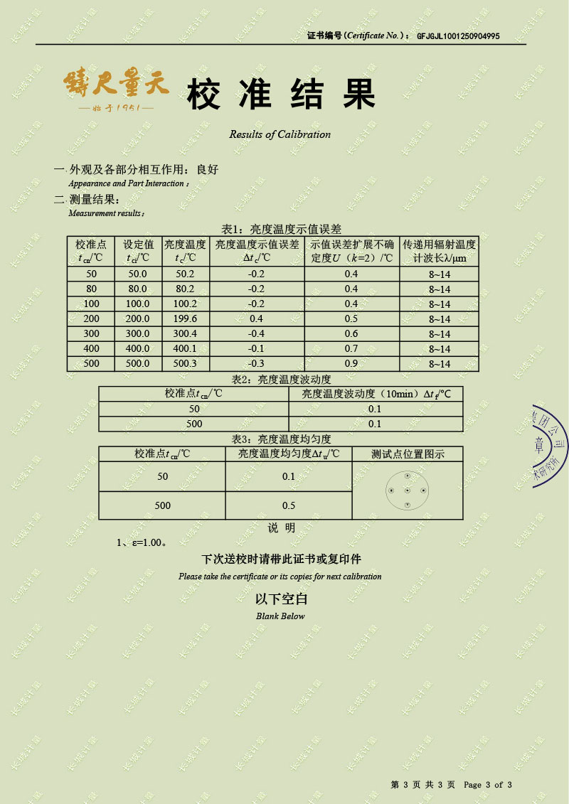 | 上一條:黑體輻射源(-15-80℃)校準(zhǔn)證書 | 下一條:水三相點瓶凍制與保存裝置校準(zhǔn)證書 |