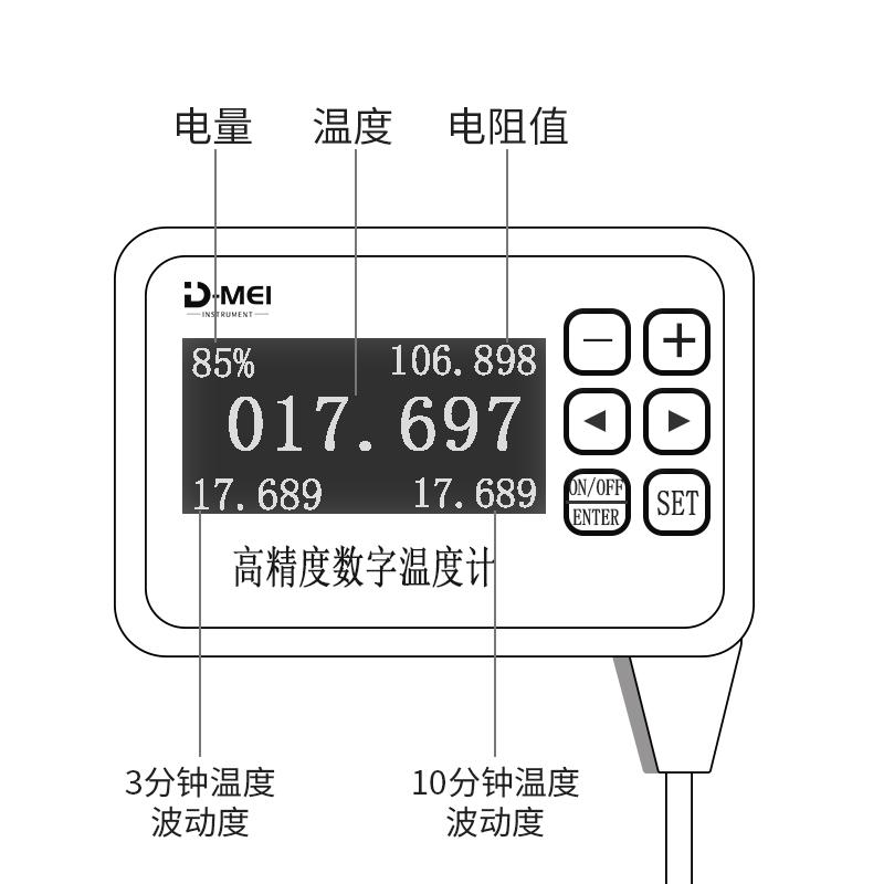 功能 | 實(shí)時(shí)顯示當(dāng)前溫度、電量顯示、電阻值、溫度波動 度、10分鐘溫度波動度自動跟蹤計(jì)算、測試功能 | |