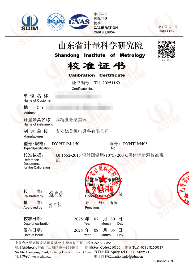 高精度低溫黑體(-10-100℃)校準證書 2025-8-6 本文被閱讀 3549 次