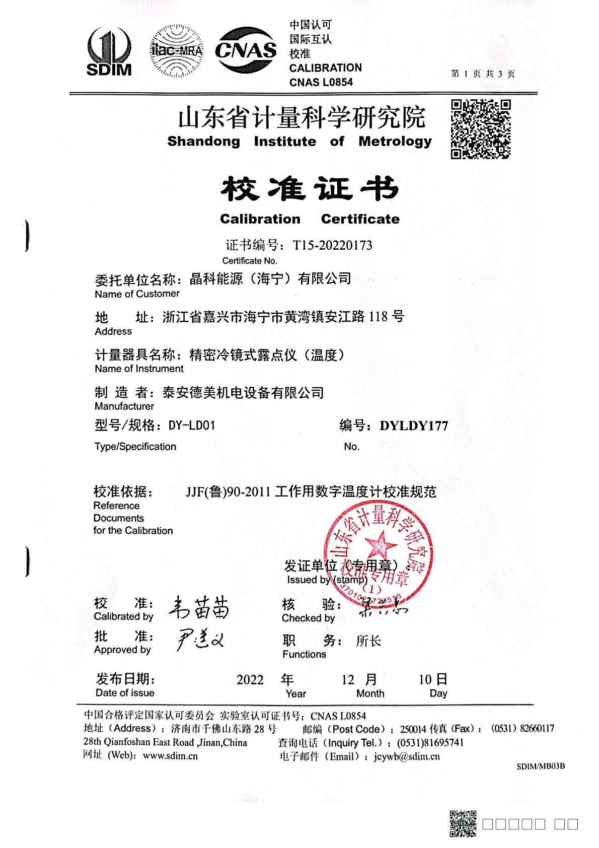 | 上一條:晶科能源(海寧)有限公司 精密冷鏡式露點(diǎn)儀 檢定證書 | 下一條:水三相點(diǎn)瓶?jī)鲋婆c保存裝置校準(zhǔn)證書 |