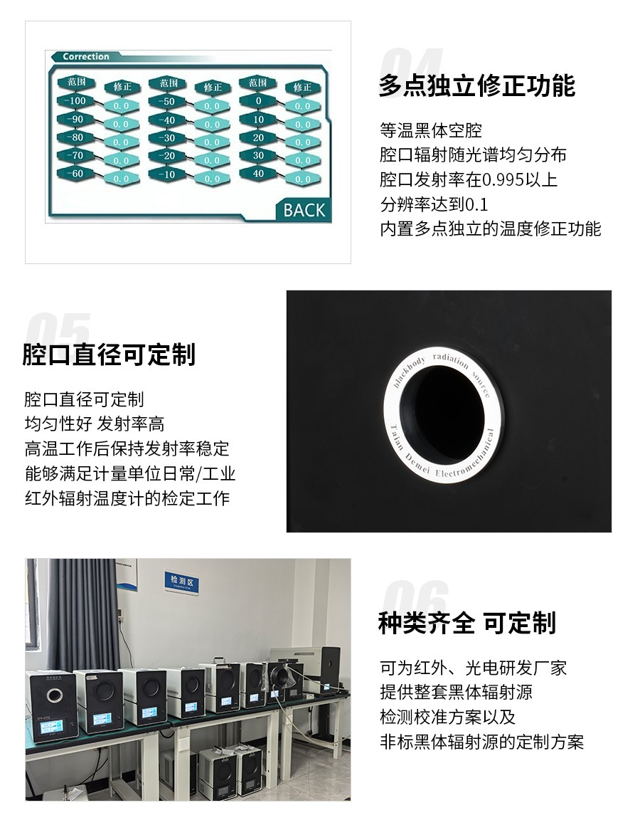 標(biāo)準(zhǔn)黑體作為標(biāo)準(zhǔn)輻射源,主要用于校準(zhǔn)輻射溫度計(jì)、紅外溫度計(jì)和輻射溫度傳感探測(cè)器。我公司目前具有先進(jìn)的黑體技術(shù),產(chǎn)品種類全、溫度范圍寬的黑體系列產(chǎn)品。產(chǎn)品體積小、重量輕、便于攜帶,不僅適合各級(jí)計(jì)量機(jī)構(gòu)實(shí)驗(yàn)室校準(zhǔn)輻射溫度計(jì)使用,同時(shí)可以用于現(xiàn)場(chǎng)校準(zhǔn)。