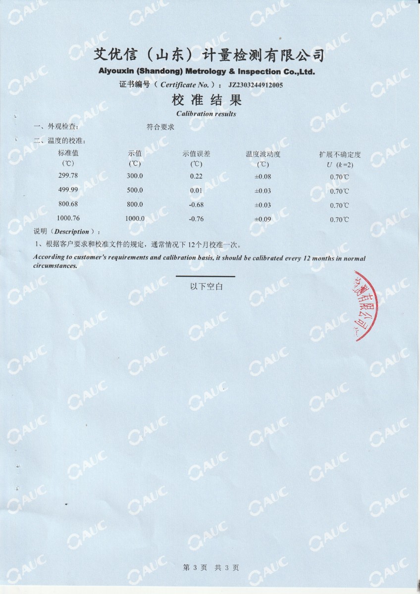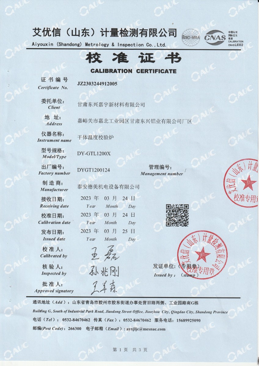 甘肅東興嘉寧新材料有限公司 干體溫度校驗爐 校準證書 2023-3-31 本文被閱讀 13556 次