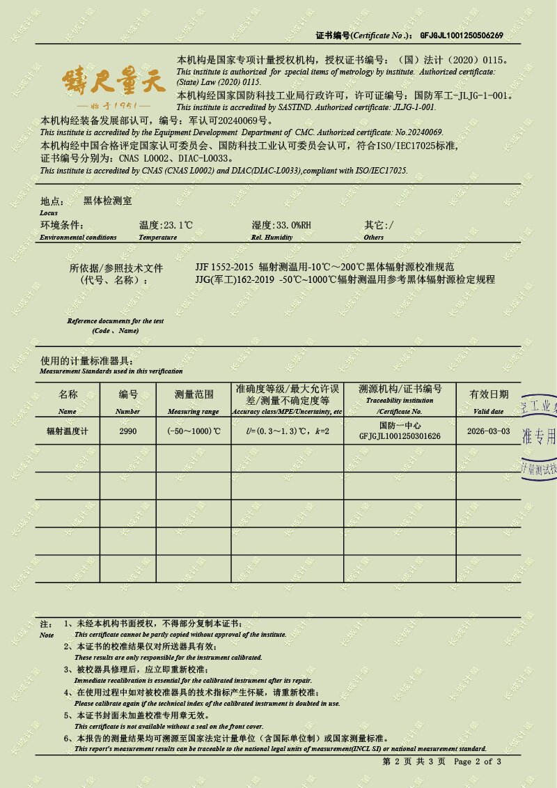 | 上一條:高溫黑體爐(300~1200℃)校準(zhǔn)證書 | 下一條:水三相點(diǎn)瓶凍制與保存裝置校準(zhǔn)證書 |