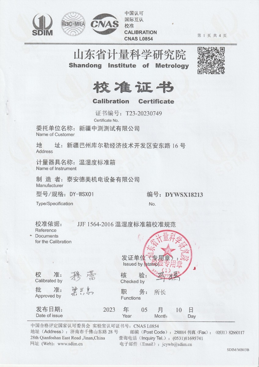 新疆中測測試有限公司 溫濕度標準箱 校準證書 2023-6-1 本文被閱讀 12636 次