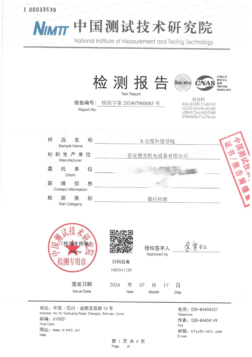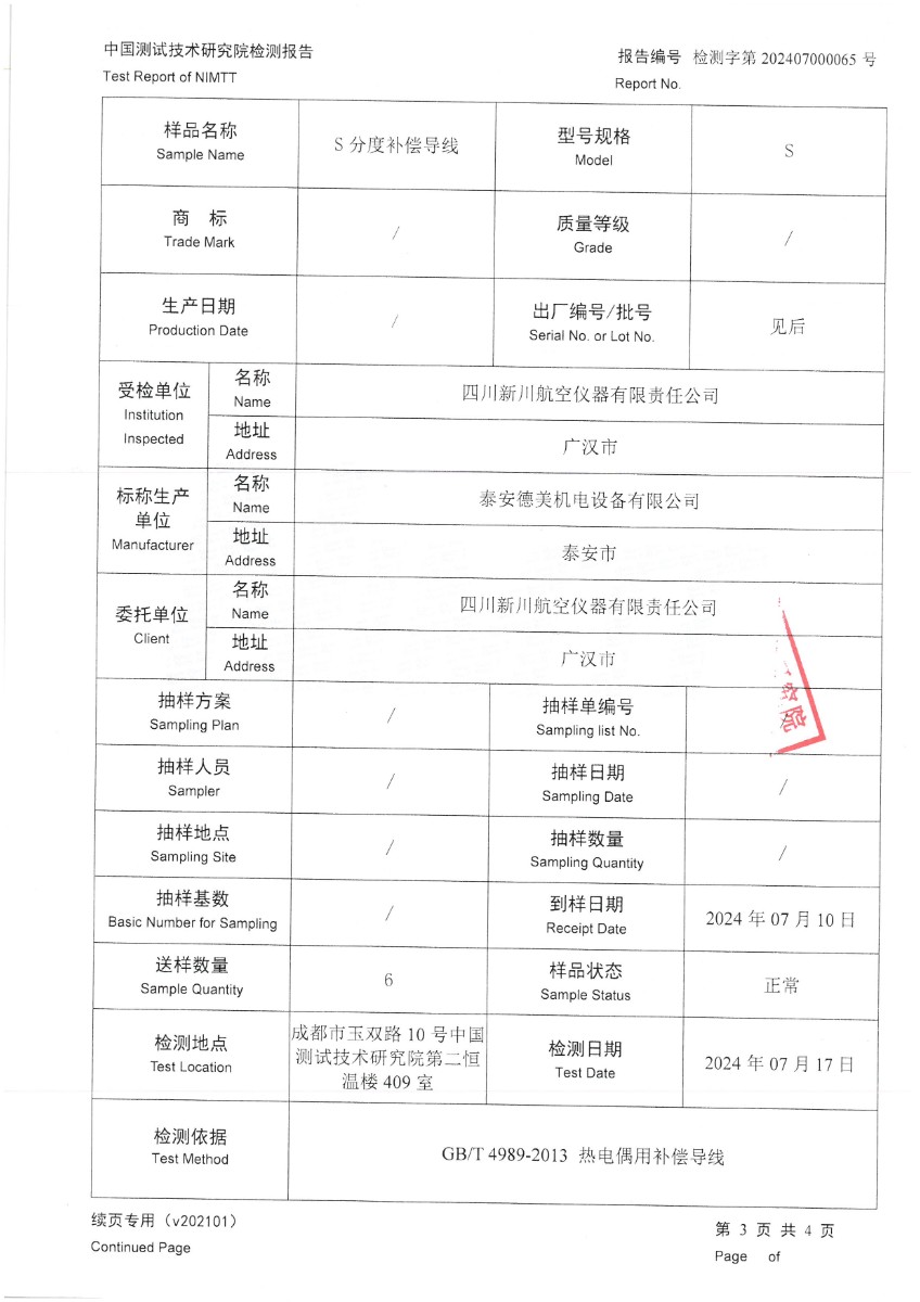 熱電偶用補償導(dǎo)線S分度檢測報告