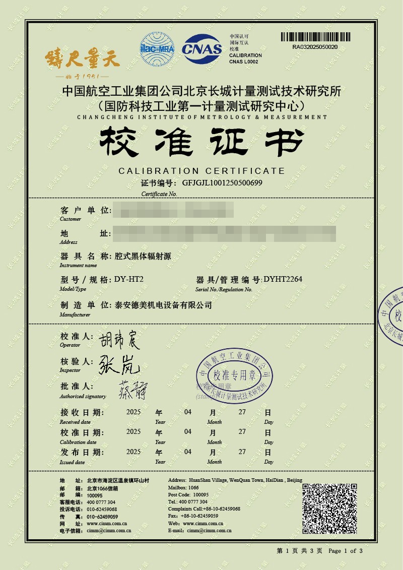 | 上一條:腔式黑體輻射源(50-700℃)校準(zhǔn)證書 | 下一條:水三相點瓶凍制與保存裝置校準(zhǔn)證書 |