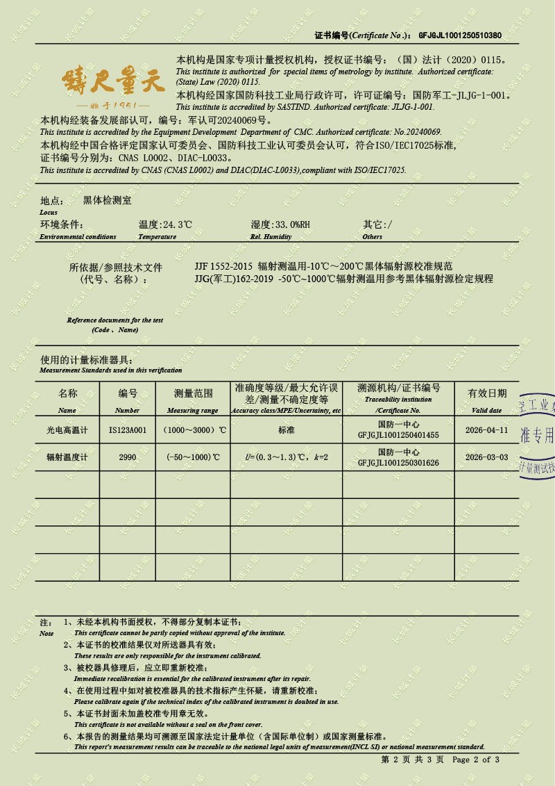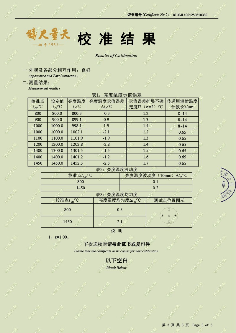 腔式黑體輻射源(800-1450℃)校準(zhǔn)證書 2025-5-28 本文被閱讀 3801 次