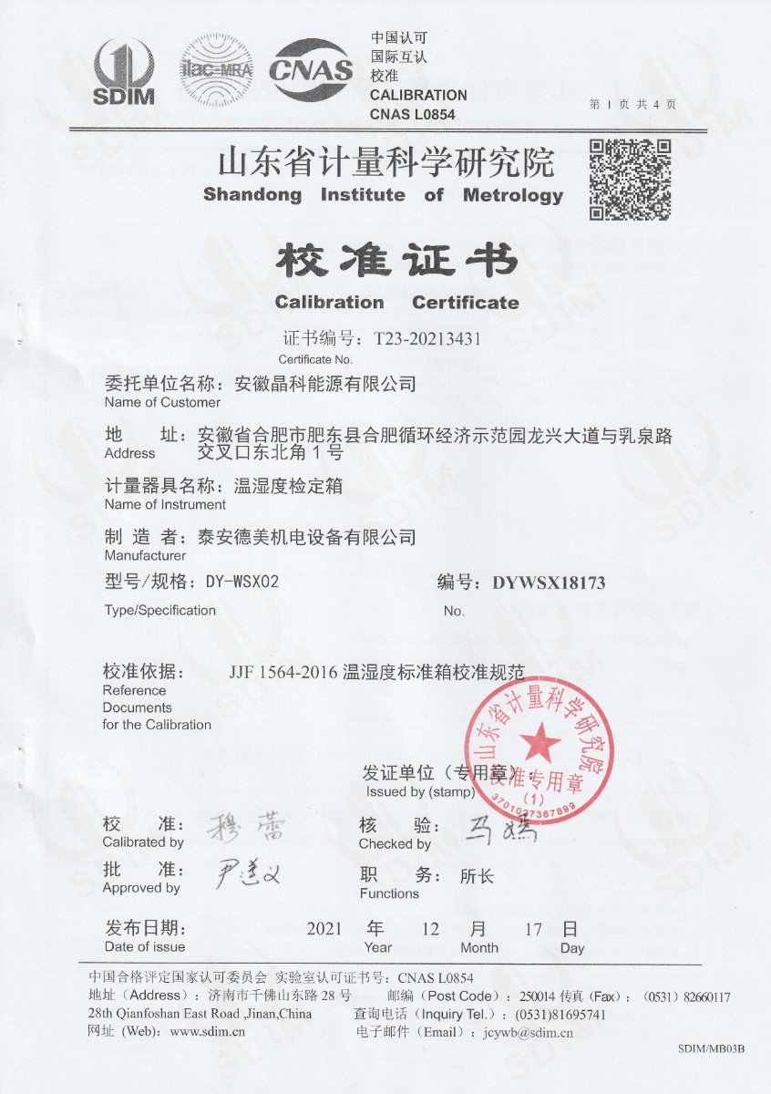 安徽晶科能源有限公司-溫濕度檢定箱 2021-12-30 本文被閱讀 15359 次
