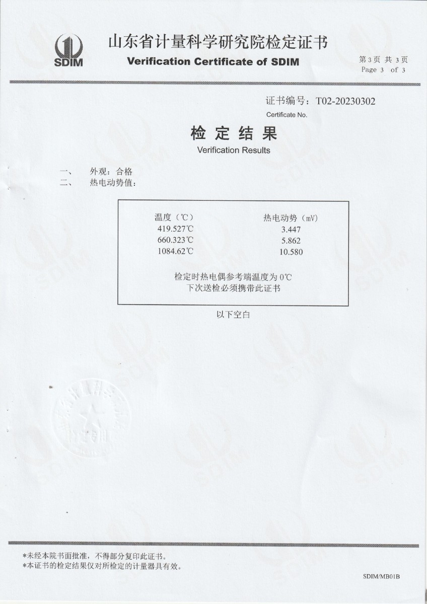 標準鉑銠10-鉑熱電偶S23-7108檢定證書