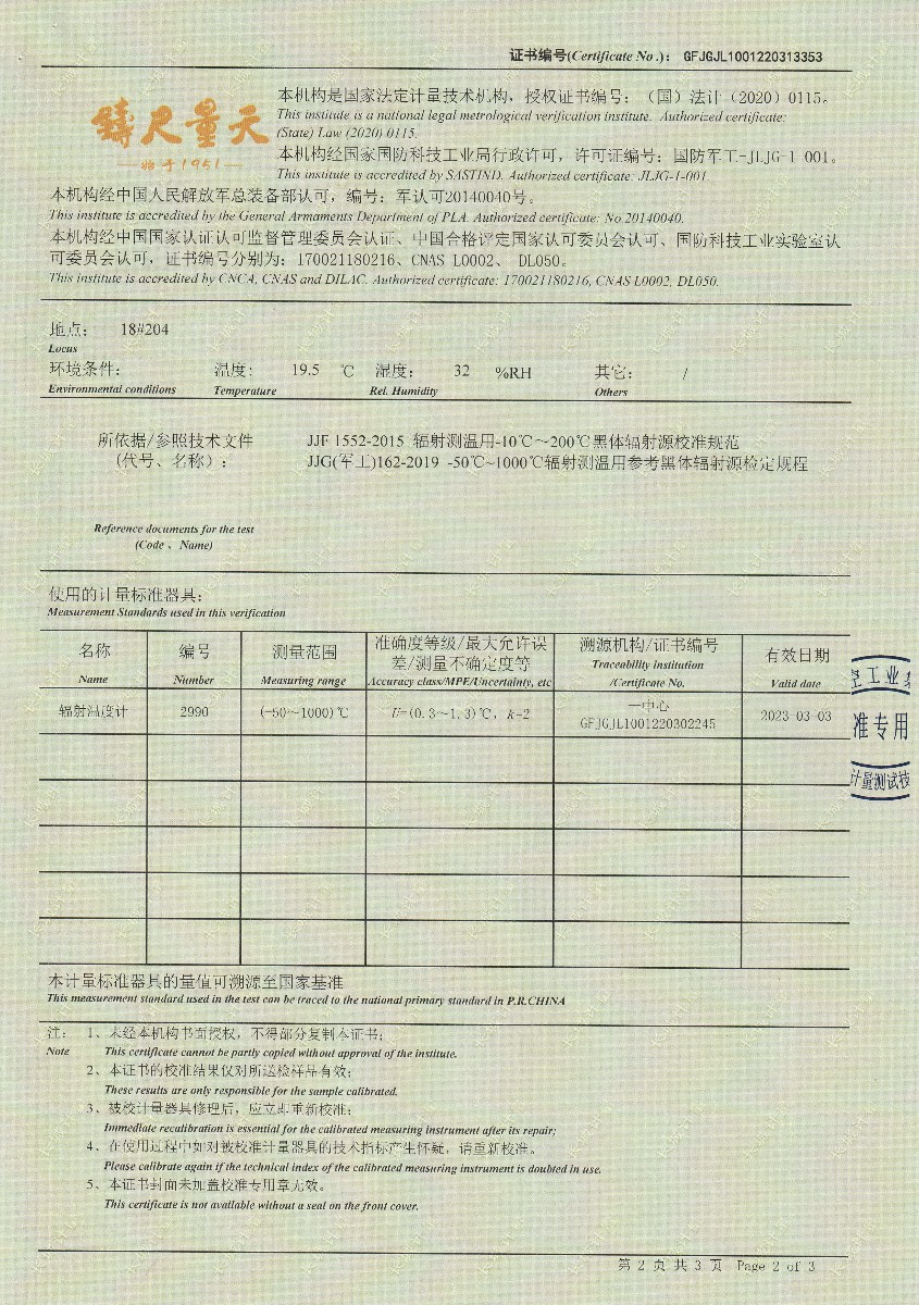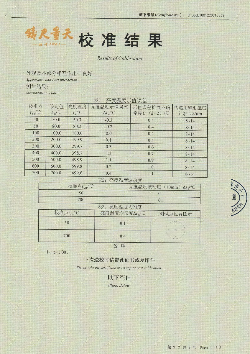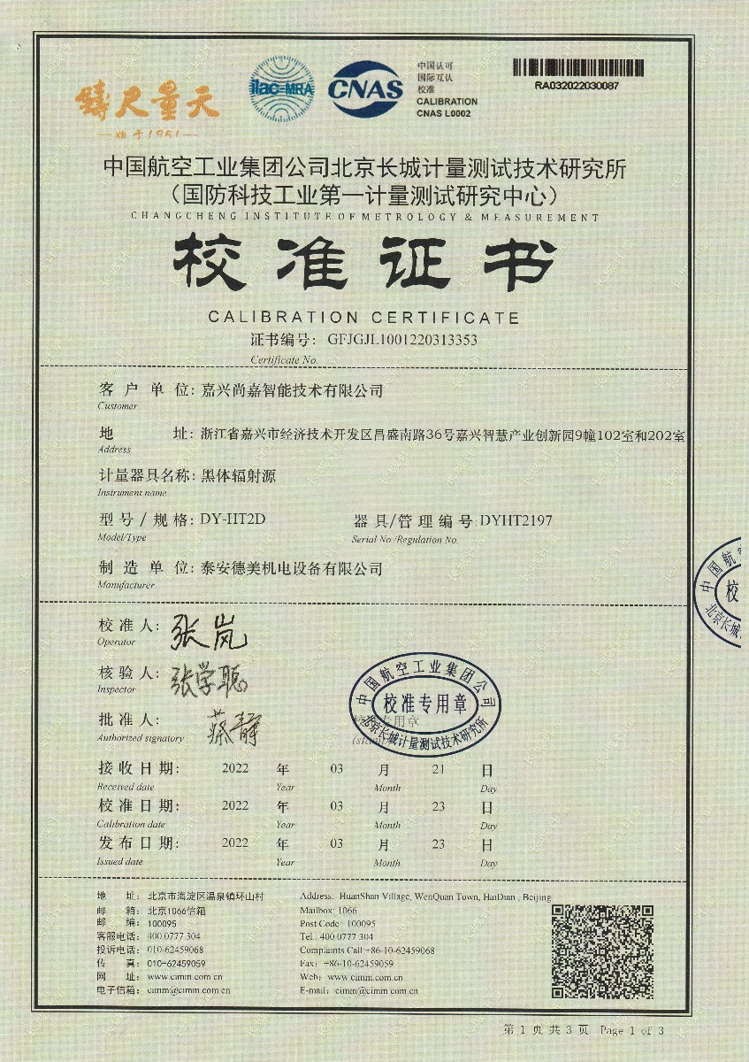 | 上一條:嘉興尚嘉智能技術(shù)有限公司-黑體輻射源(DY-HT1A) | 下一條:水三相點瓶凍制與保存裝置校準證書 |